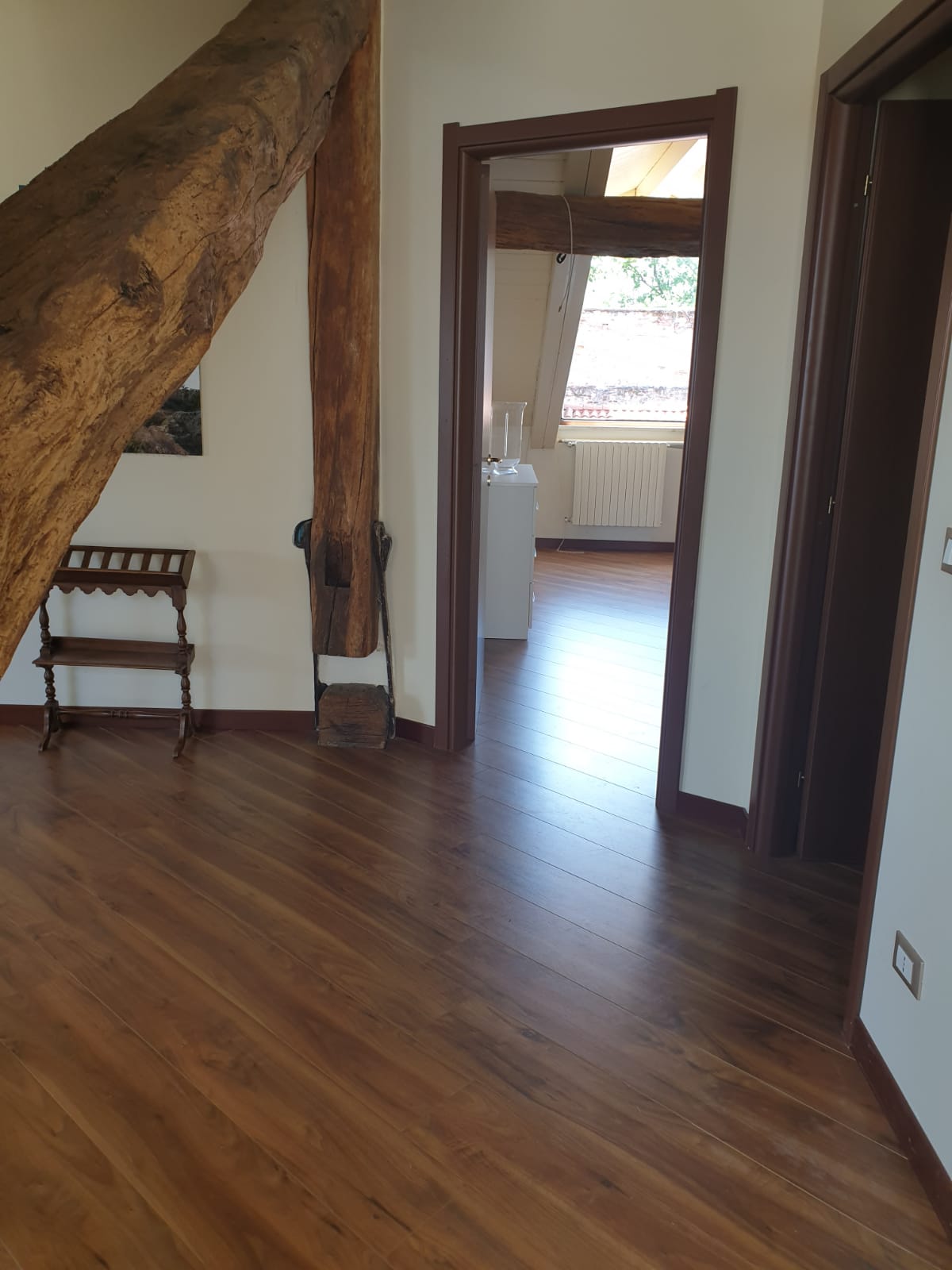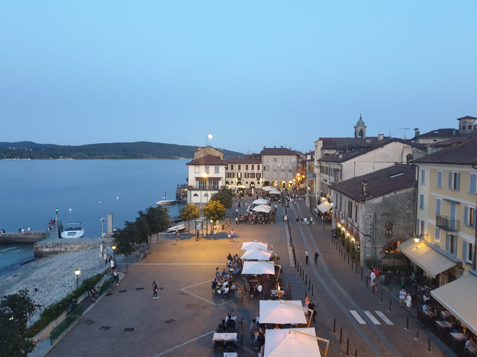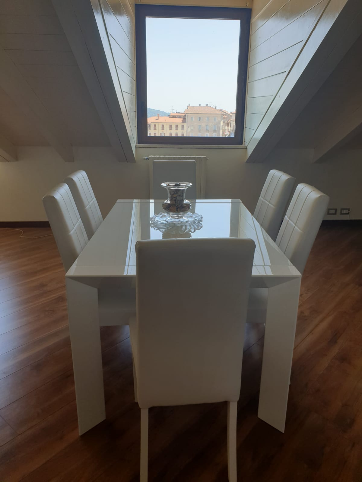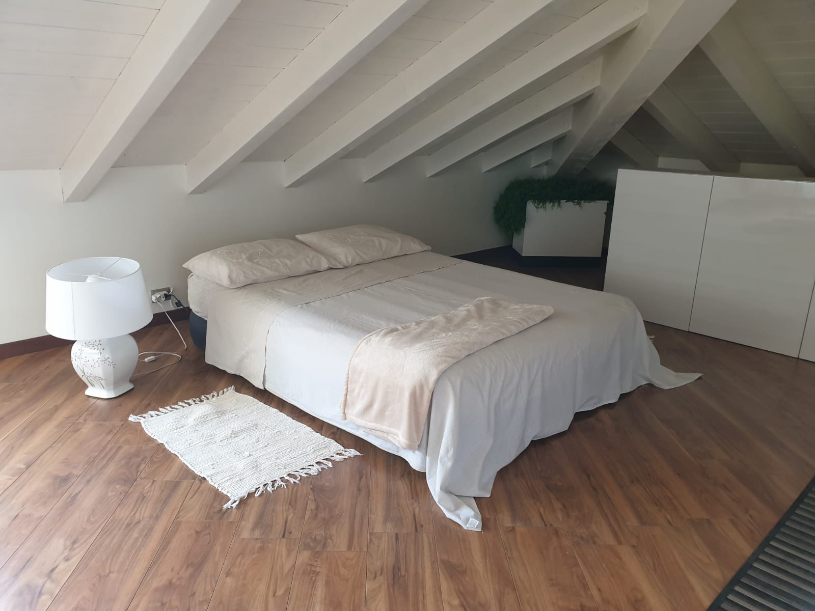 Grande e affascinante romantica mansarda con pavimento in legno e travi a vista. Panorama mozzafiato sul lago e sulla piazza.